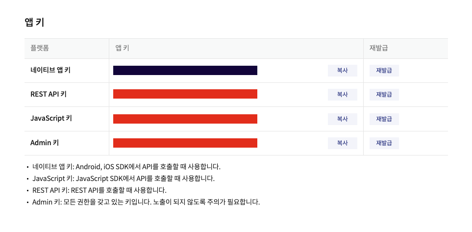 전 iOS 앱이다보니 네이티브 앱 키를 사용하였습니다. 설명을 보니 Admin키를 사용해도 되는 것 같네요.