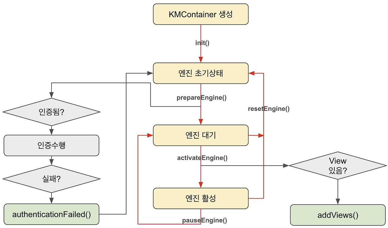 - KMController: 엔진-앱 인터페이스 연결, 인증 절차 및 엔진 상태 관리 담당합니다. 엔진의 초기화 및 Start, Stop, 그리고 렌더링 상태를 컨트롤 할 수 있습니다.