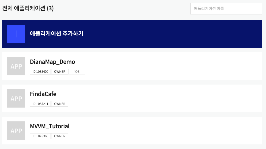 여기서 애플리케이션 추가하기를 눌러 앱 이름, 회사 명을 넣은 뒤 생성을 완료해줍니다.