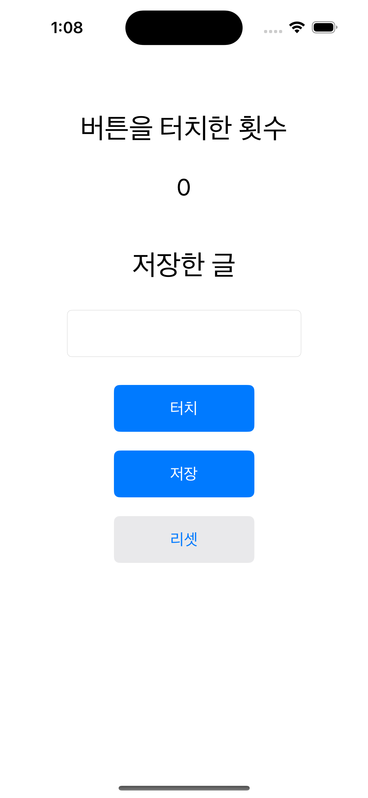 해당 앱은 터치 버튼을 누르면 횟수가 증가하고 텍스트 필드에는 간단한 글도 작성이 가능합니다.
