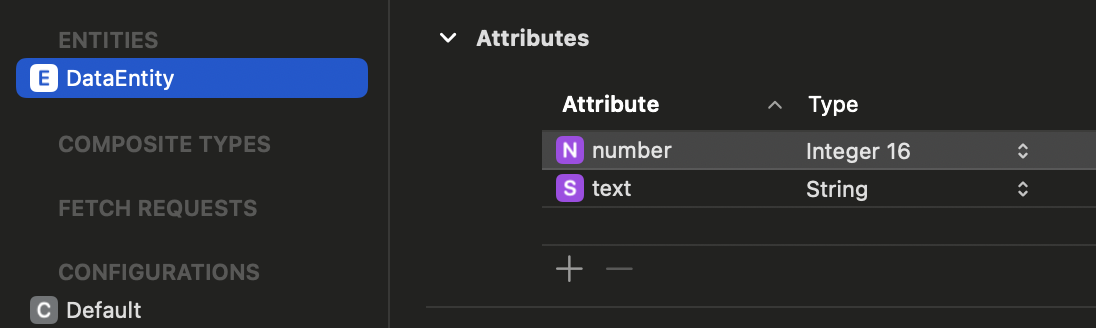 코어데이터는 데이터 모델 에디터를 통해 데이터 타입과 데이터 간의 관계 그리고 관련된 클래스 정의를 정의할 수 있도록 도와준다고 하네요.