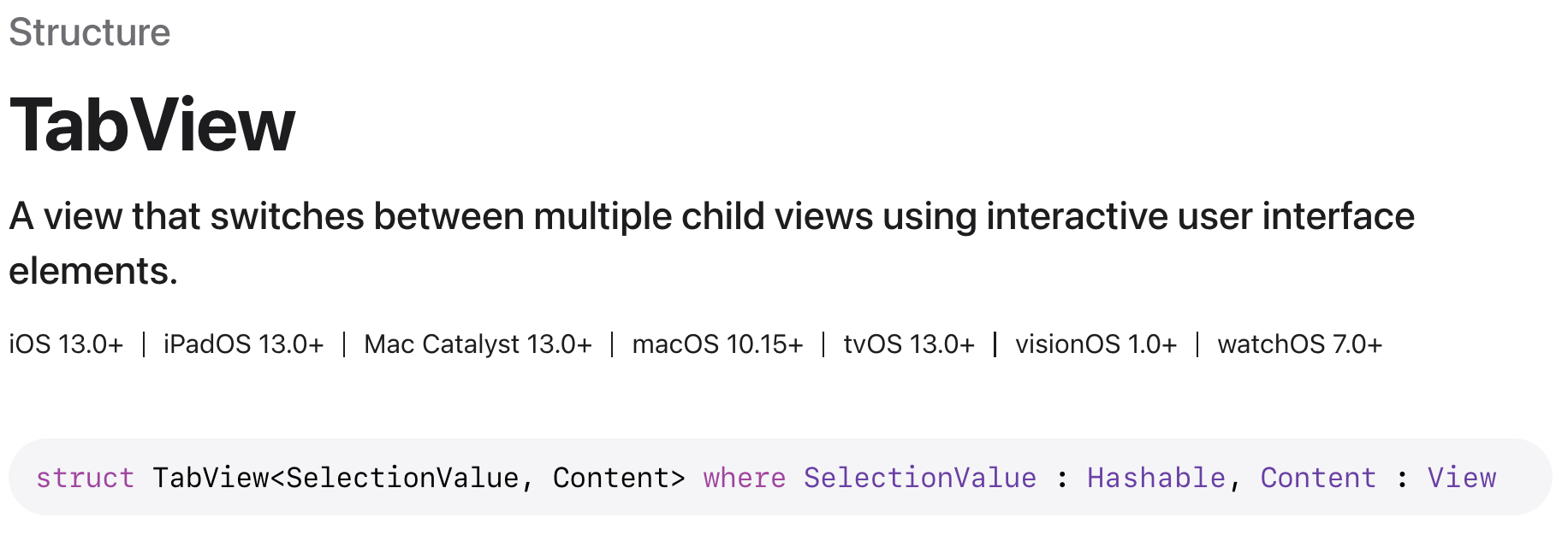 공식문서에 따르면 TabView는 Interactive 유저 인터페이스 요소들을 사용하여 여러 자식 뷰 사이를 스위칭하는 것이라고 합니다.