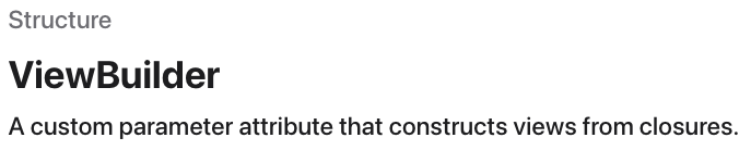 공식문서에 따르면 ViewBuilder은 클로저의 파라미터로써 뷰를 구성한다고 합니다.