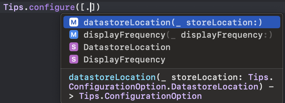 try? Tips.configure([.displayFrequency(.immediate), .datastoreLocation(.applicationDefault)])