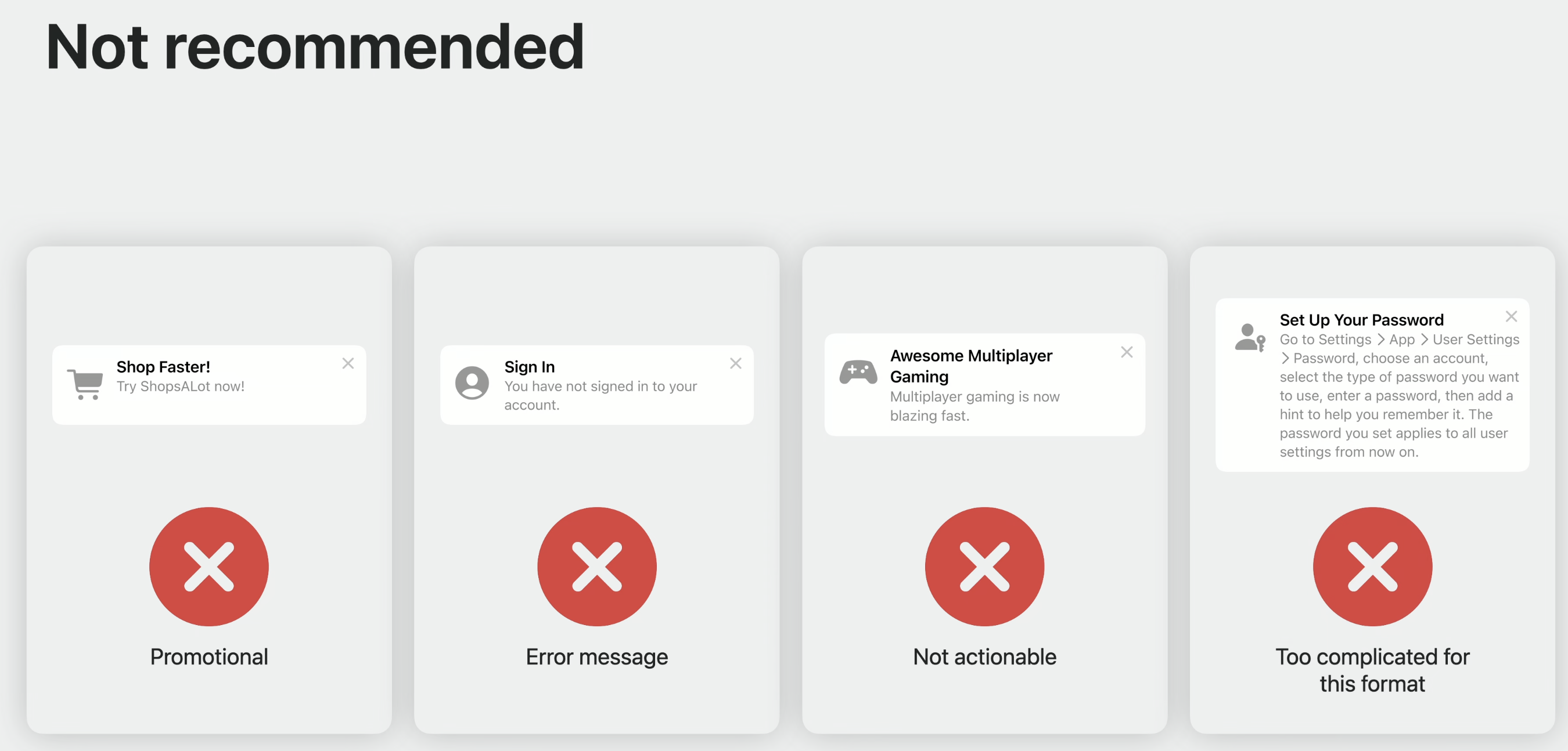위 예시들은 TipKit 사용이 지양되는 방향으로 각각의 Tip 들은 홍보를 목적으로 하고, 에러메세지를 나타내며 유저의 액션을 필요로 하지 않고 너무 복잡하고 기억하기 쉽지 않습니다.