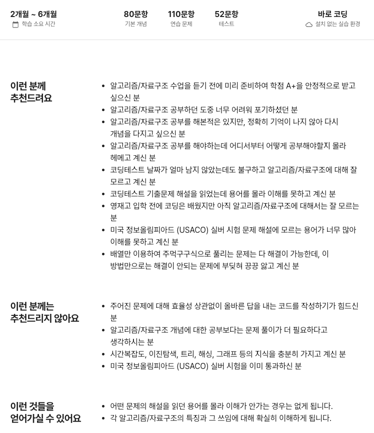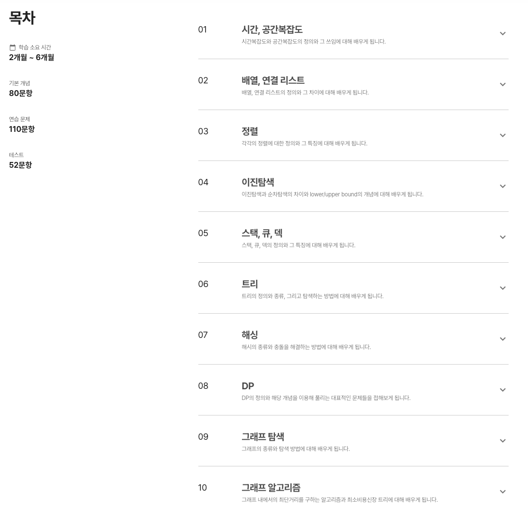 원하는 과정을 눌러보면 과정 설명을 확인할 수 있는데요, 저는 아무래도 제일 약한 부분인 자료구조, 알고리즘을 선택하였습니다.