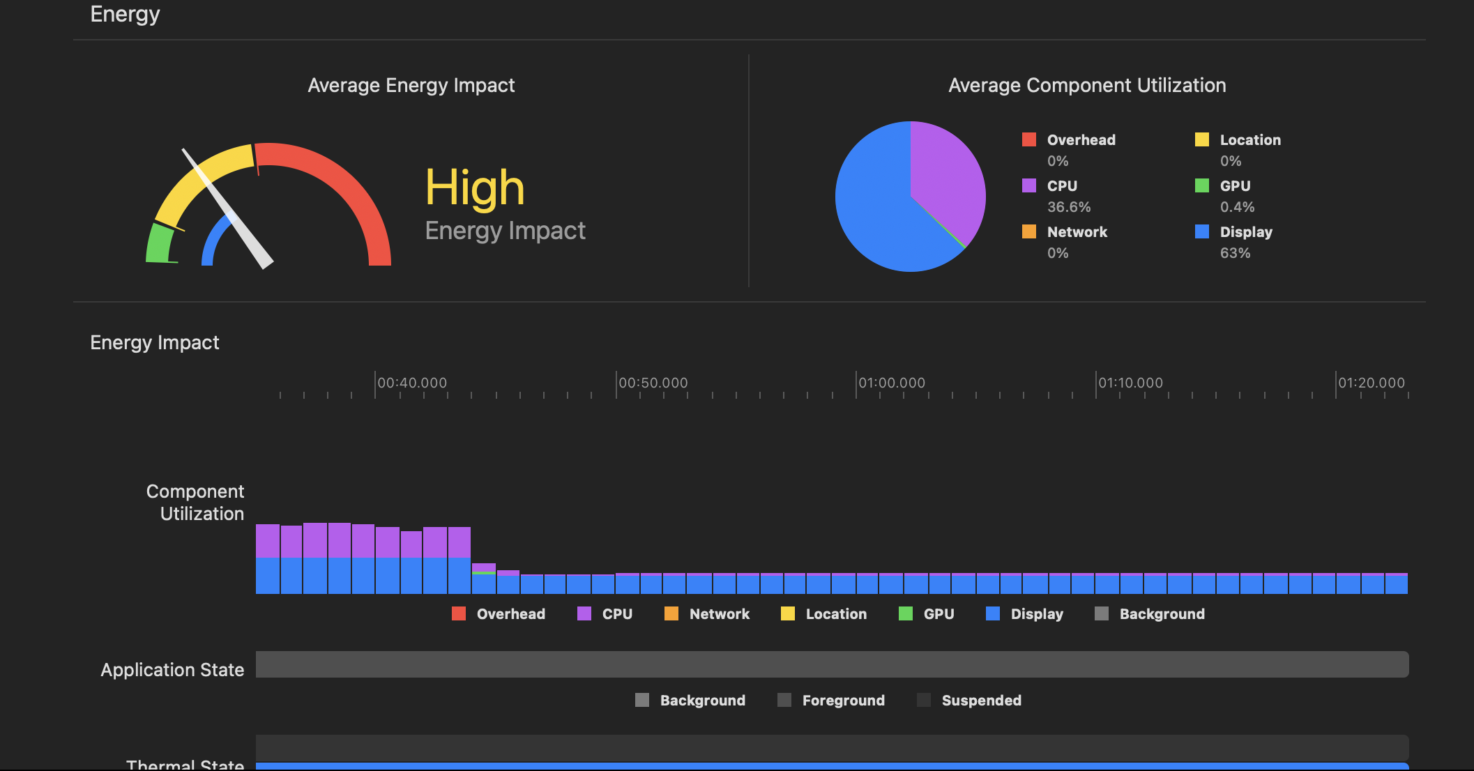 그 결과 디버깅 세션을 확인해보면 CPU와 에너지 사용량은 금새 정상 범주로 돌아오게 됩니다.
