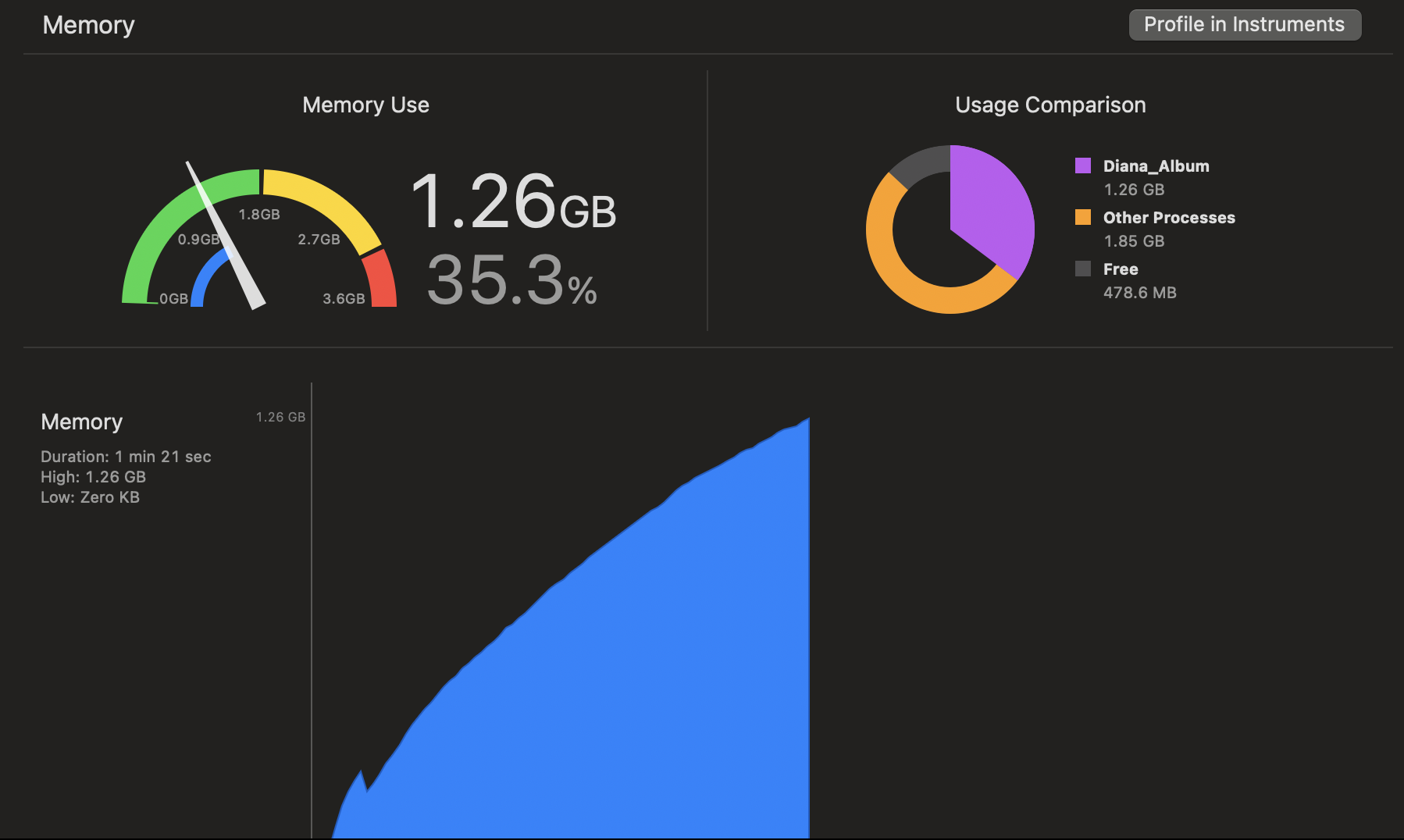 두 번째, 아래 창을 보면 40초동안 앱이 실행될 때 메모리와 에너지 사용량이 폭발합니다. 그리고 이미지가 뜬 이후에도 메모리 사용량은 계속 증가합니다. 이는 PHAsset과 PHCacheImageManager의 작동 방식을 좀더 알아볼 필요가 있을 것 같습니다.