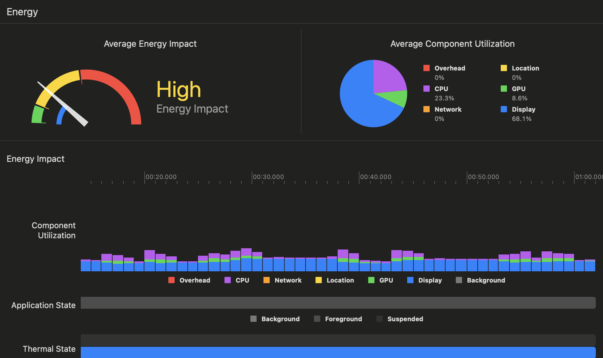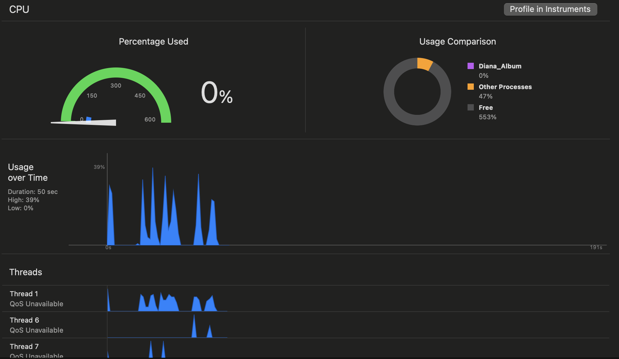 또한 CPU와 에너지 사용량을 확인해보면 스크롤하여 이미지를 받아올때만 사용량이 잠깐 늘어날 뿐 상당히 안정적이게 된 모습을 확인 할 수 있습니다.